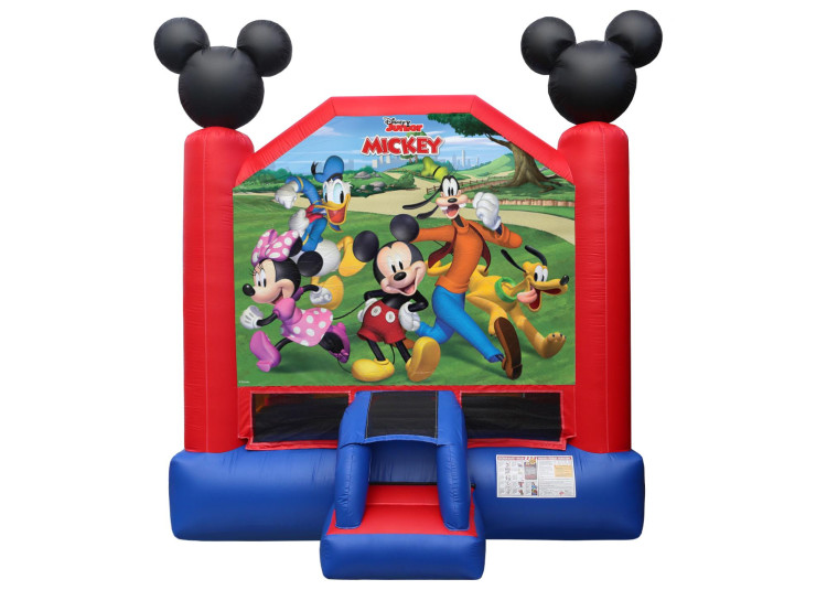 Make way for adventure with MICKEY AND FRIENDS 13’ x 13' bounce house.  It has plenty of space for up to 5 best pals at a time to bounce, hop, skip, and jump to their heart's content.  Made in the USA with premium materials by master craftsman, the MICKEY AND FRIENDS bounce house is designed with fully licensed digital artwork and iconic Mickey Mouse Ears embellishments on top of both front vertical pillars.  It is action-packed awesomeness that is suitable for all occasions.  This inflatable is compliant with the ASTM's revised standards (F2374-17) with additional safety features such as a safer entrance/exit ramp and emergency exit.